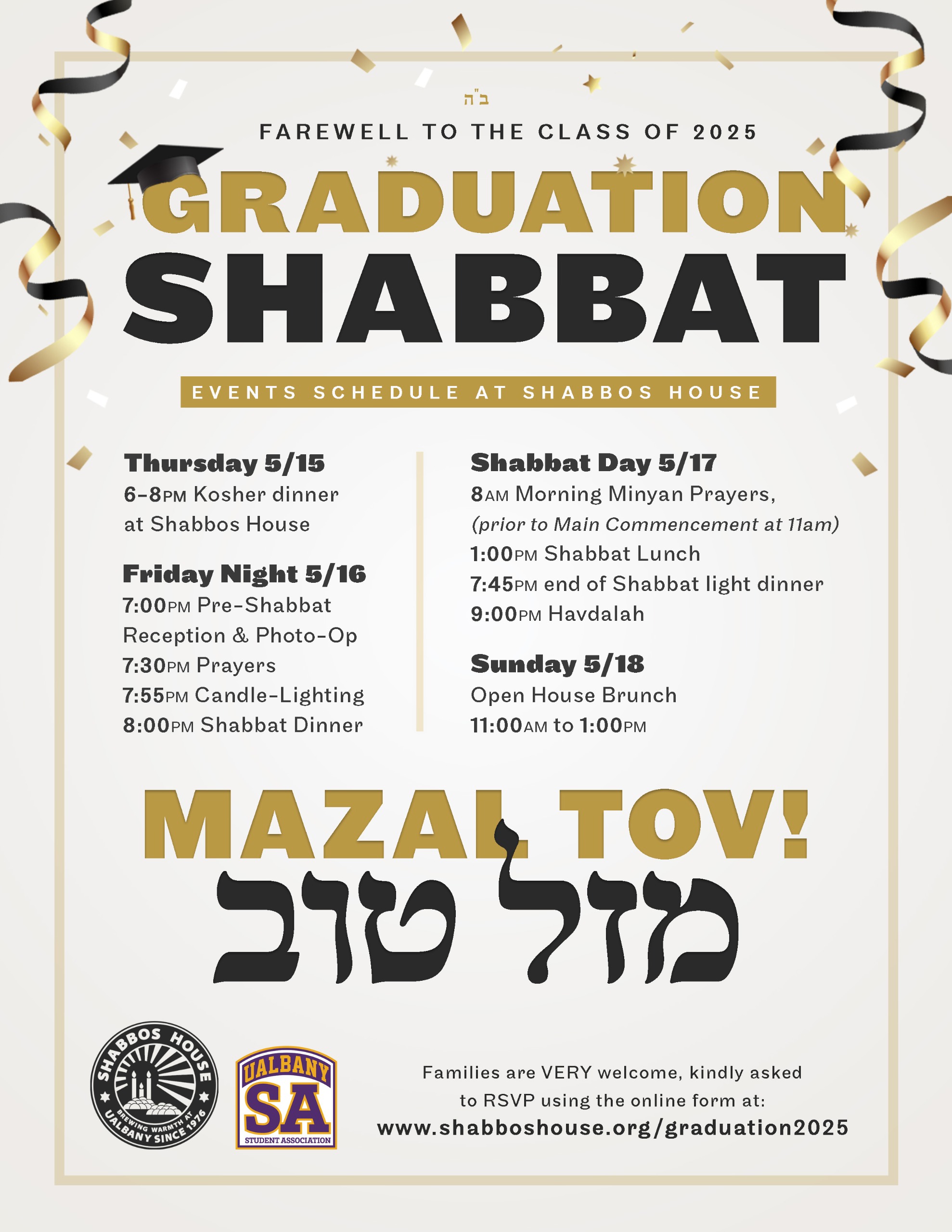 Candle-lighting 4:04pm (this is as early as it gets in Albany NY). Prayers 6:20pm. Shabbat Dinner at Shabbos House 7pm.