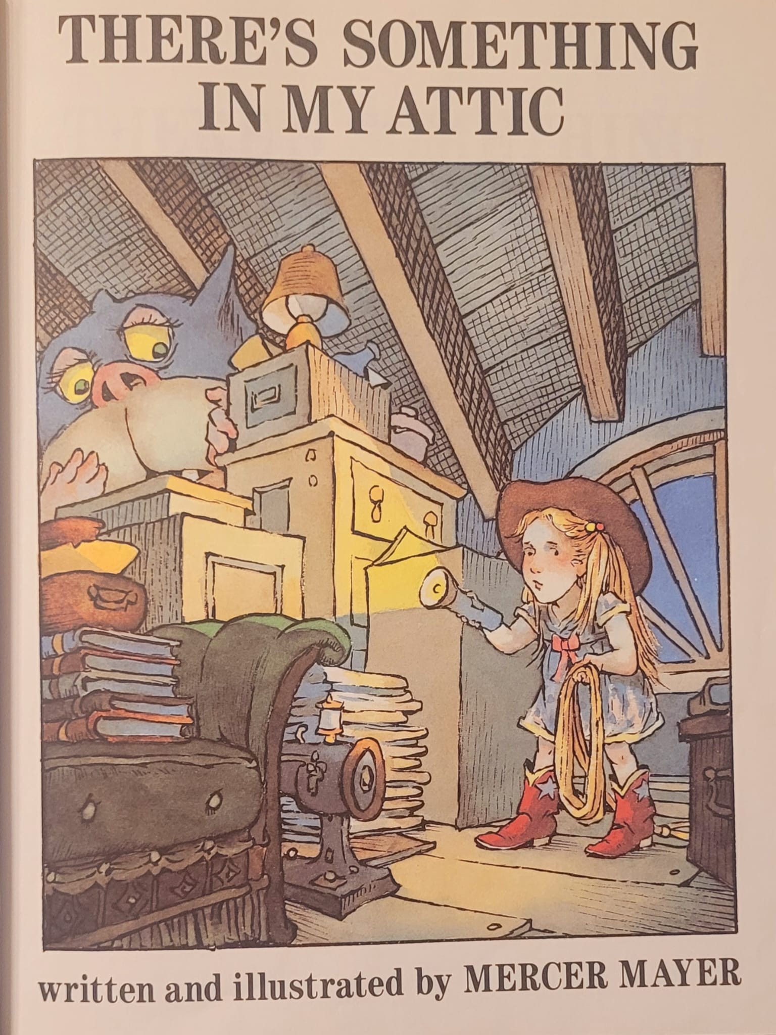 In the “There’s Something in the Attic” (1988) the little girl keeps hearing sounds in the attic. Her parents dismiss her concerns. She finally ventures up – with a lasso in hand, with cowboy hat and boots, and manages to corner and trap the monster up there! She’s eager to bring it down to show her parents, but in the last minute the larger monster slips out of her lasso and is gone. But she still feels somewhat assured that (1) her concerns were valid (2) she got it under control, she had it lassoed, even if just for a little bit!