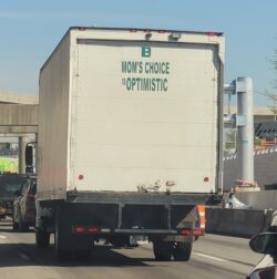 Raizy and I were driving along the Van Wyck in NYC when we saw this green lettering on the back panel of a white box truck. “Mom’s Choice is Optimistic”. It took some driving closer up to the side of the truck to learn it a truck from “Optimistic Transport” and the mom message is a slogan of theirs.